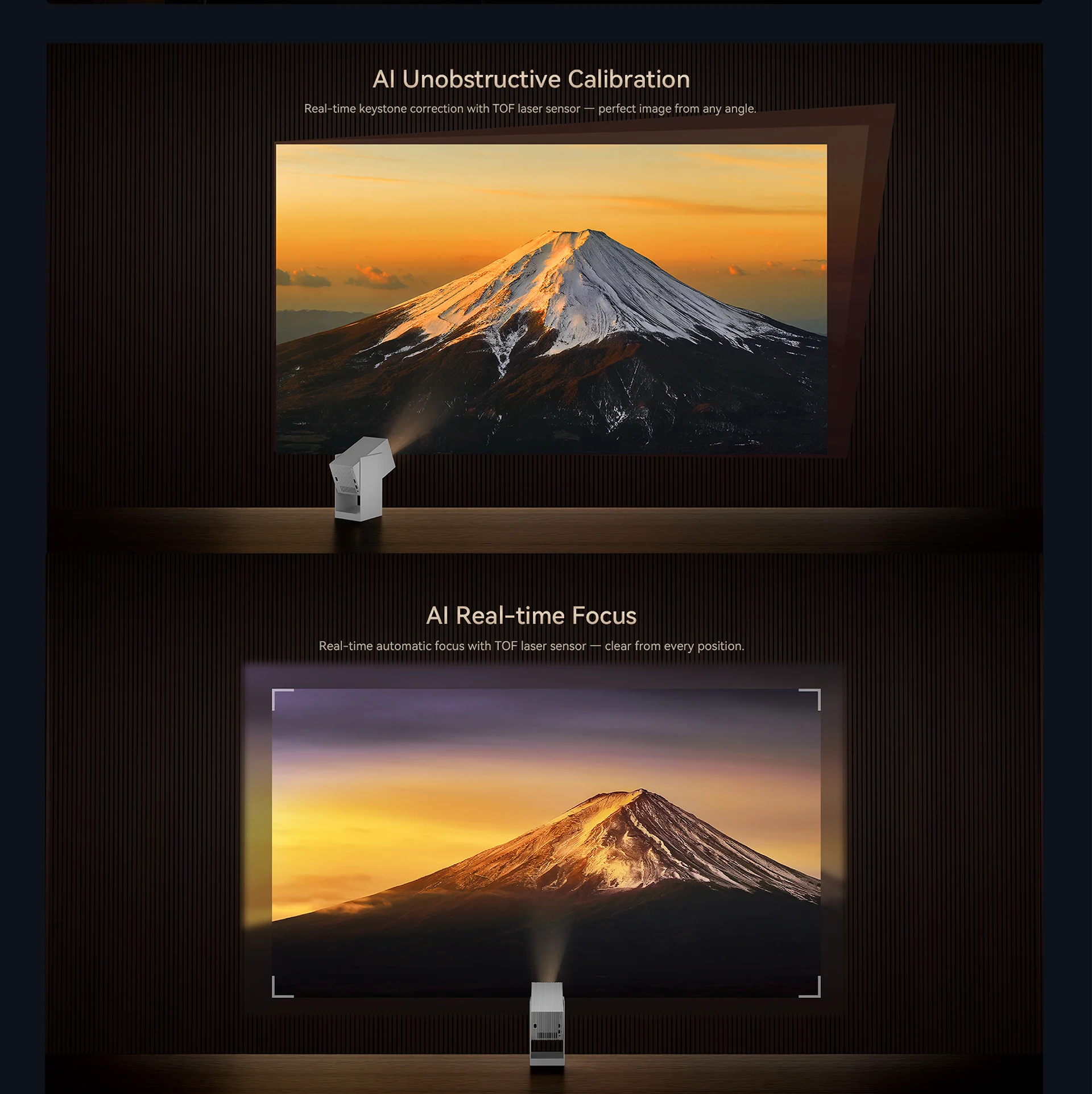 Résultat : une image nette et bien alignée sans aucun réglage manuel, même après déplacement du projecteur.