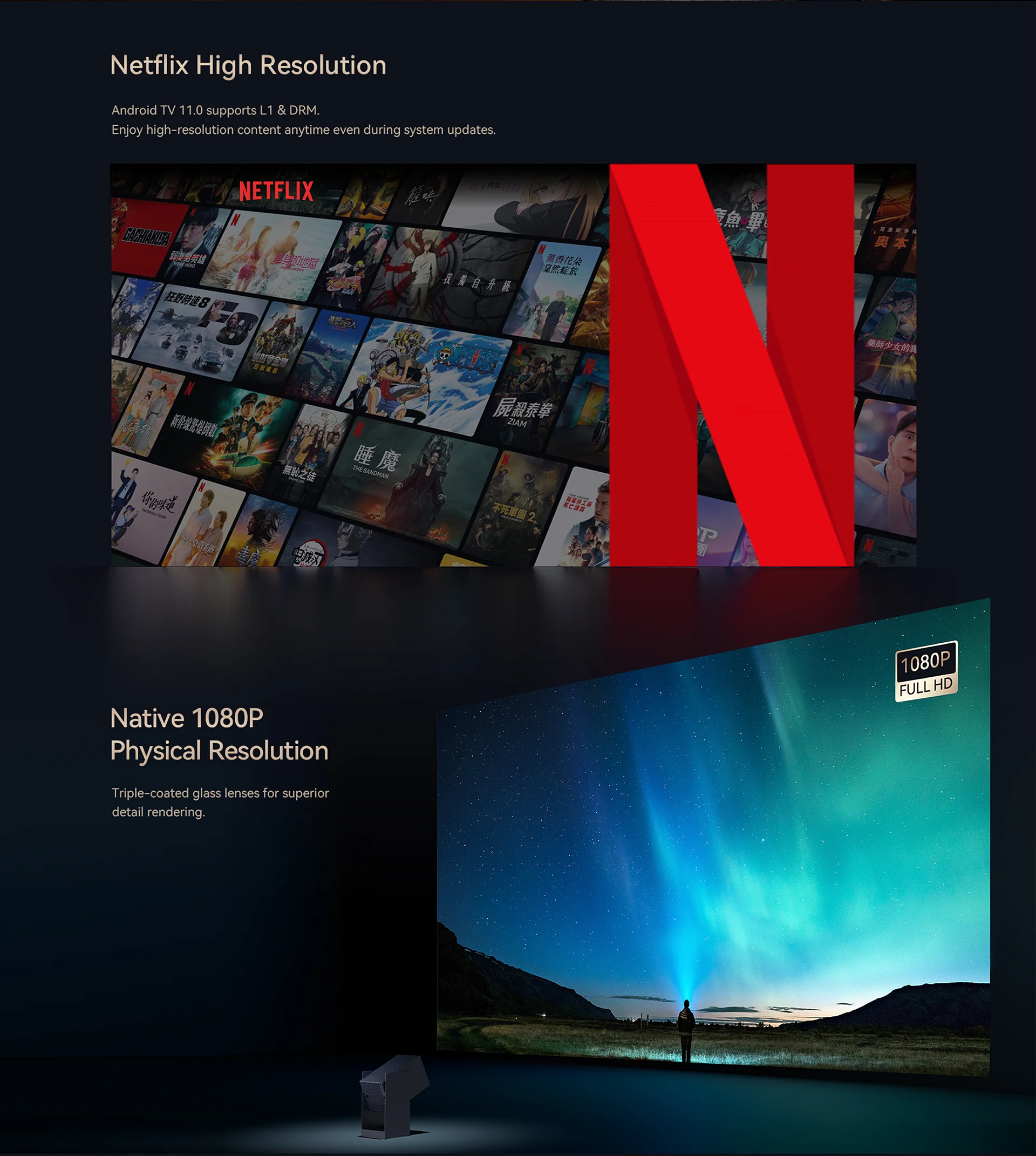 Avec sa résolution native 1920×1080 (Full HD) et sa luminosité réelle de 500 ANSI lumens, le Cube 2 Pro délivre une image claire, stable et bien contrastée, idéale pour une utilisation en intérieur, en soirée ou dans une pièce modérément éclairée.