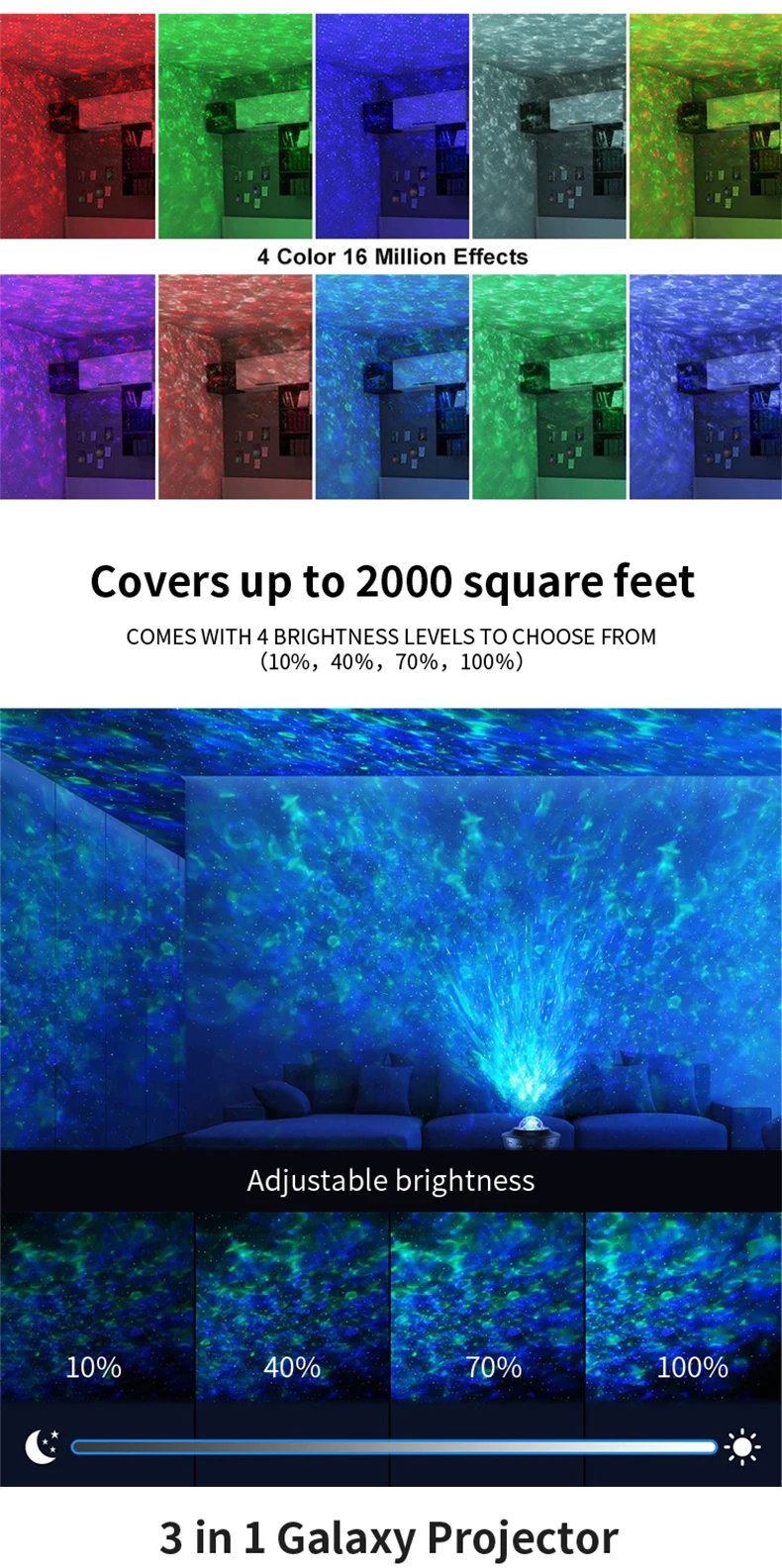 Ce projecteur crée une atmosphère céleste en diffusant des effets de nébuleuses, d’étoiles et de mouvements lumineux. Il permet de transformer une chambre ou un salon en un espace apaisant ou festif selon le moment. Grâce à son haut-parleur intégré et à sa télécommande complète, l’utilisateur gère facilement la lumière, la musique et la minuterie.